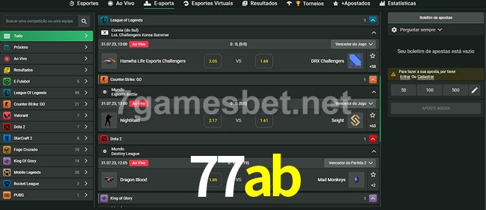 O 77ab oferece uma grande seleção de opções de apostas em e-sports com probabilidades competitivas